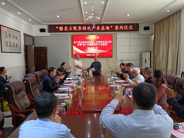 2023年4月15日上午,共建“赣北五眼果特色产业基地”签约授牌仪式在我校举行。江西省林业局科学技术和对外合作处处长谢利玉、江西省林业局林业产业发展处处长蔡德毓、我校副校长黄英金、科技处处长游金明、林学院院长陈伏生、原副校长杜天真教授、林学院张露教授、余干县林业局副局长左平辉等领导和专家应邀出席。余干县生态林业总场、余干县云梅涧农业发展有限公司和我校南酸枣科技创新团队部分师生参加了签约授牌仪式。我院副院长吴南生教授与云梅涧公司董事长李锋分别代表双方签约,副校长黄英金教授为基地授牌。