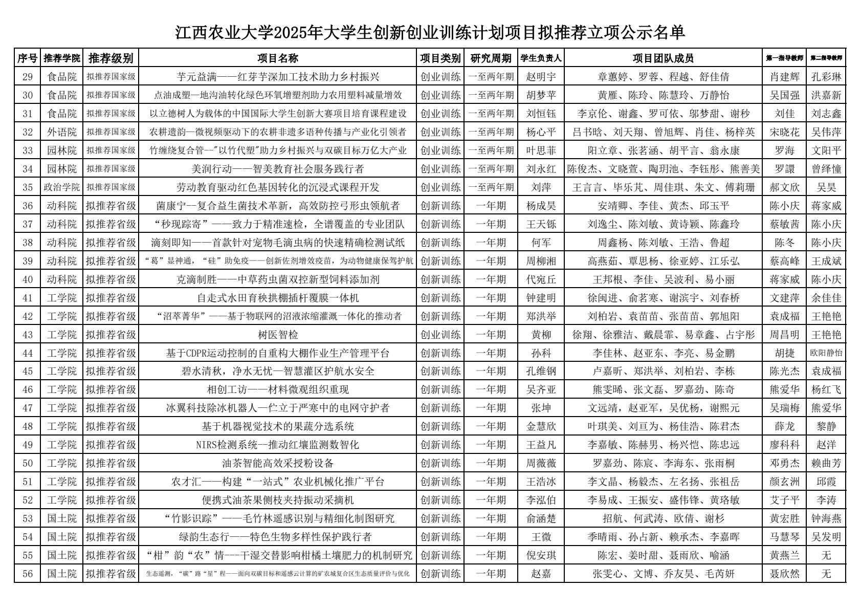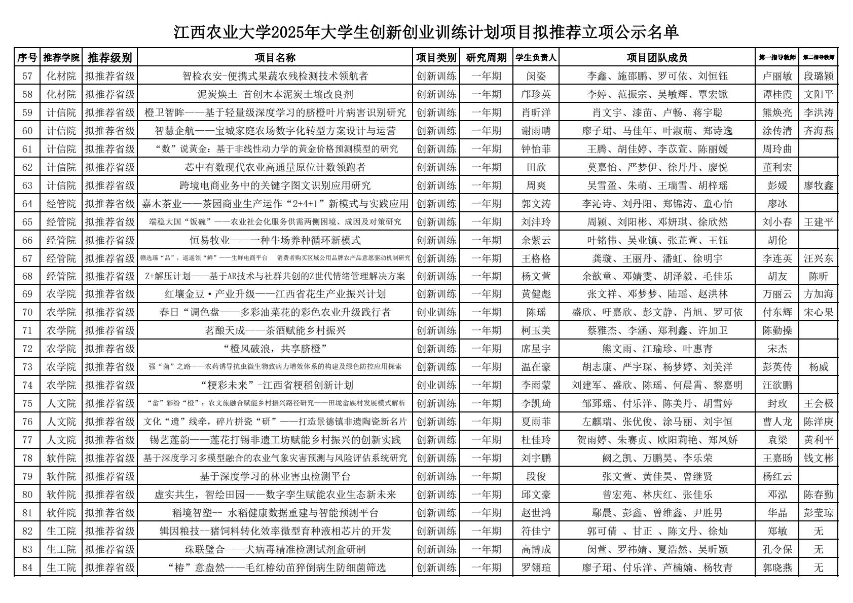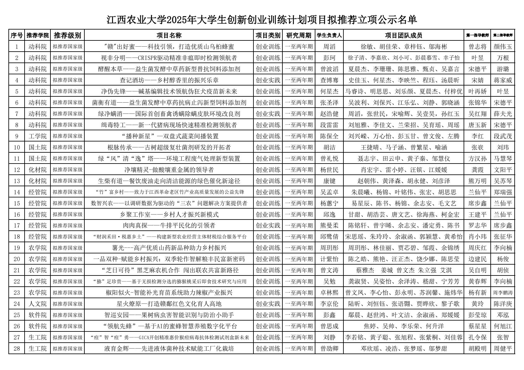 江西农业大学2025年大学生创新创业训练计划项目拟推荐立项公示名单