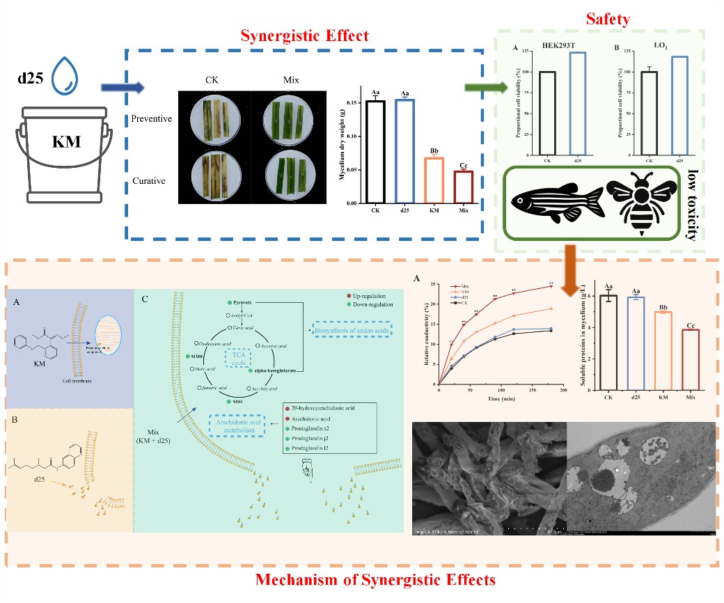 水稻作为全球最重要的粮食作物之一,养活了世界一半以上的人口。水稻纹枯病是水稻生产中的重大病害,由土传真菌Rhizoctonia solani引起,是水稻生产中最具破坏力的病害之一。醚菌酯作为首批上市的甲氧基丙烯酸酯类杀菌剂,广泛应用于纹枯病防治,但其长期使用易引发抗药性,降低防效。为提高其使用效率,中心研究团队前期以天然产物柠檬醛为原料合成了一系列酰胺衍生物,从中筛选出了具有显著增效作用的衍生物d25。研究表明,d25与醚菌酯按一定比例复配后可显著增强对R. solani的抑制活性,增效系数最高达2.66;在水稻叶片体内试验中亦展现出优异的预防和治疗效果。同时,机制研究表明,该复配处理能干扰病菌的能量代谢和细胞膜稳定性,显著增强杀菌作用。毒理安全性评价显示,d25对人源细胞、蜜蜂和斑马鱼均表现出低毒性,生态风险较小。本研究系统阐明了柠檬醛酰胺衍生物作为杀菌剂协同增效剂的作用机制,拓展了天然产物在农药助剂领域的应用,为抗性管理提供了新策略,也为开发高效、低毒、绿色农药制剂提供了重要理论支撑和实践基础。