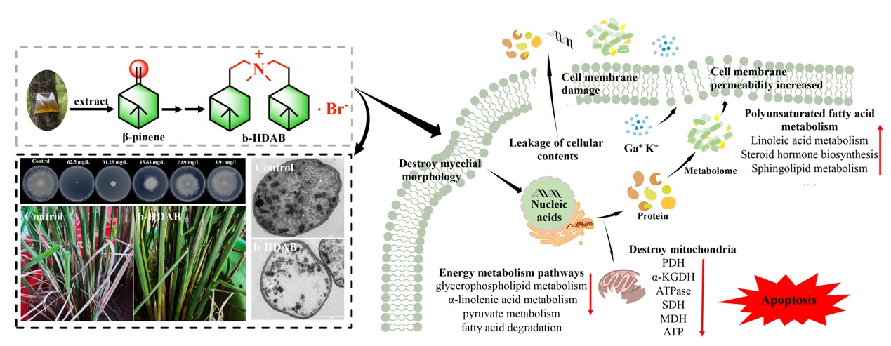 立枯丝核菌(Rhizoctonia solani)是一种广泛危害作物的植物病原体,可引发植物病害,降低作物产量,危害粮食安全。β-蒎烯作为松节油的主要成分,是开发新型杀菌剂的先导化合物。团队前期设计合成了一系列含季铵盐骨架的β-蒎烯衍生物,其中双氢化诺卜基二甲基溴化铵(b-HDAB)表现出广谱抑菌活性。本研究旨在揭示b-HDAB抑制立枯丝核菌的作用机制。实验表明,b-HDAB具有显著抗菌效果(EC50 = 10.20 mg/L,EC90 = 18.43 mg/L);500 mg/L剂量下防治立枯丝核菌的效果(59.82%)与阳性对照井冈霉素(60.58%)相当。研究发现b-HDAB可破坏菌丝正常形态与超微结构,增加菌丝相对电导率,导致核酸和蛋白质外渗。此外,b-HDAB抑制了三羧酸循环(TCA)相关酶,通过与丙酮酸脱氢酶(PDH)的精氨酸残基(RP357)形成π-阳离子键而表现出良好的结合稳定性。代谢组学分析显示b-HDAB处理会提高不饱和脂肪酸含量,转录组学证实其能破坏能量代谢通路。本研究为开发b-HDAB作为新型抗真菌制剂提供了理论依据。