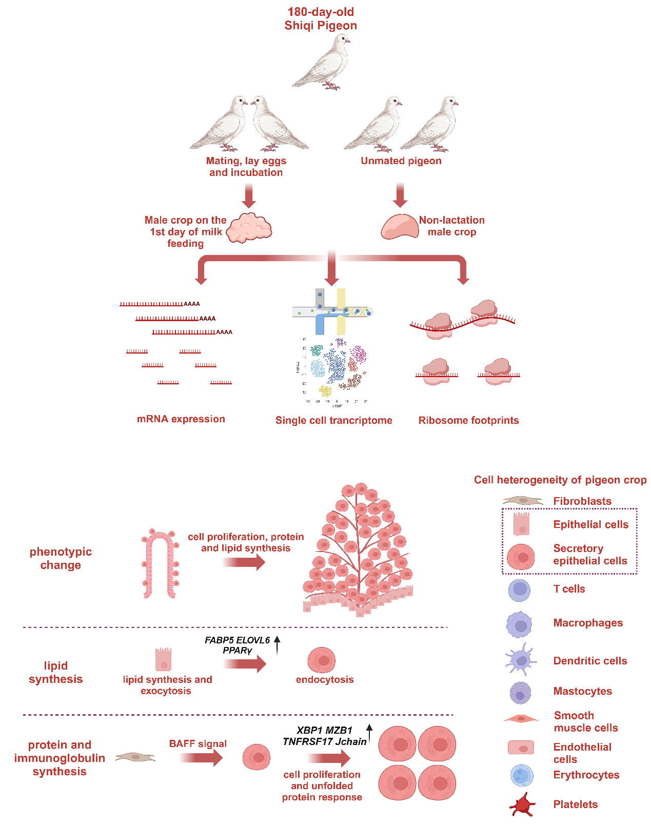 动物哺乳的生理过程及调控机制一直是人们的研究热点。哺乳动物母体的哺乳行为不仅能维持幼崽生命,还能建立起母体与幼崽的亲密关系。在一些鸟类,如鸽,嗉囊可以分泌富含蛋白质、脂肪的物质维持幼鸟生长、免疫所需。与哺乳动物不同的是,公鸽和母鸽同样有泌乳和哺乳行为。哺乳动物的泌乳过程及调控机制的研究已较多,但鸽嗉囊分泌鸽乳的研究报道较少,且调控机制有待解析。本研究采用单细胞转录组、翻译组、Bulk转录组三种测序手段,解析了公鸽嗉囊组织的细胞组成,鉴定了鸽乳中的脂质由基底层上皮细胞合成,而蛋白质及免疫球蛋白是由一种高表达浆细胞marker基因(Jchain、MZB1、XBP1等)的分泌型上皮细胞合成。本研究鉴定了公鸽嗉囊分泌鸽乳的分子机制,有助于鸟类及家禽生物学的理解。