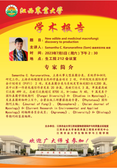 【学术报告】预告:New edible and medicinal macrofungi:discovery to production