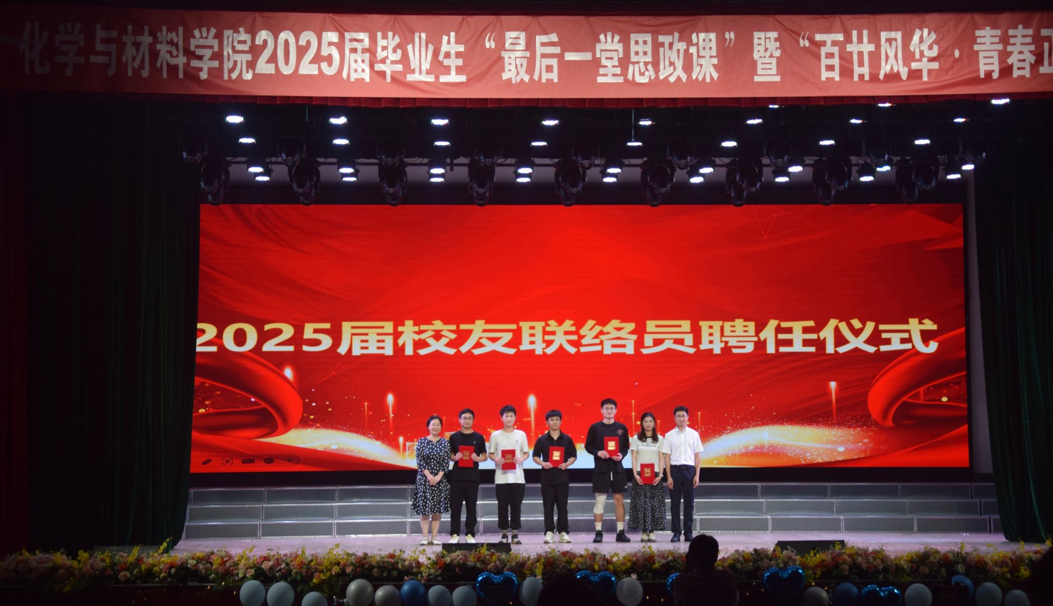 除了精彩的文艺表演,学院为2025届优秀毕业生逐一颁发荣誉证书,祝贺他们大学四年的努力付出,愿他们带着这份荣耀,在未来的征途上继续加油,让青春在新的天地里续写更璀璨的篇章。同时,学院还进行了2025届校友联络员聘任仪式,勉励校友联络员做好学校、学院与校友搭建沟通桥梁,助力校友工作开展,促进学校、学院与校友联络。